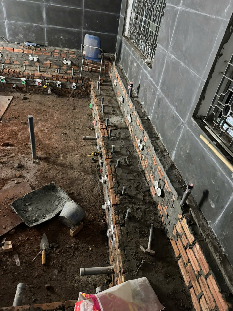 Đổ bê tông cốt thép hoặc xây gạch: làm tường và đáy bể.